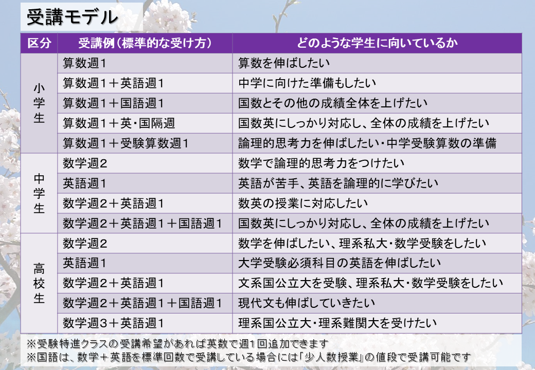 - 中学生のときは英数のポイントの解説と演習の授業+進学レベルの演習授業