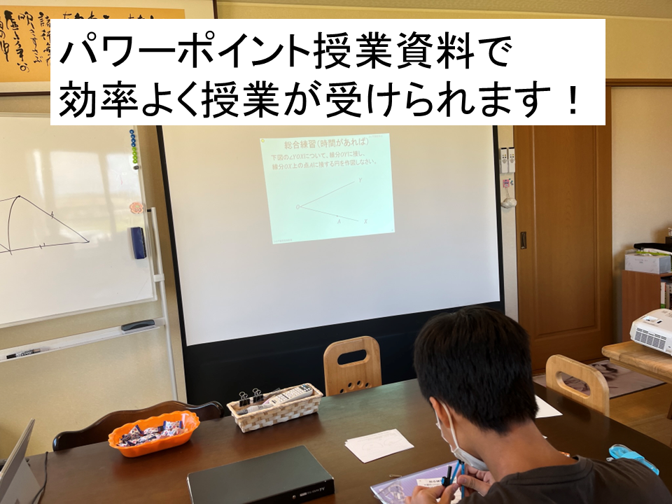 の2種類があります。ほとんどの授業でスライドを見せながら解説を重ね、また、問題演習と直接指導を通じて学習の定着を図っています。